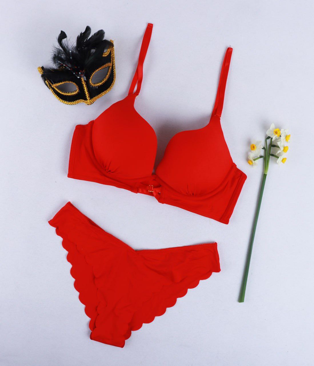ست سوتین و شورت اسفنجی فنردار با لایه نازک اسفنج جنس عالی داری بند قابل تنظیم شورت آن لیزری هست داخل فاق آن از پارچه نخی استفاده شده